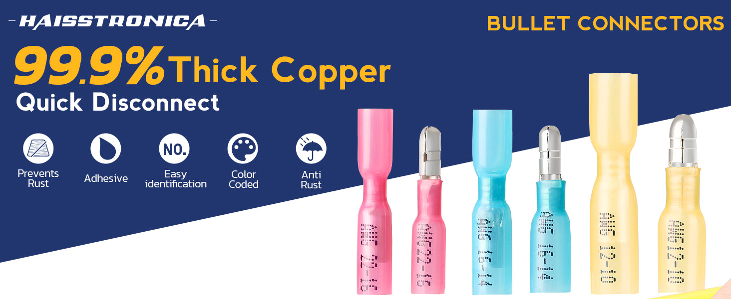 Haisstronica bullet connectors feature pure copper construction and 3:1 heat-shrink tubing, giving every male and female bullet wire connector excellent conductivity with a waterproof, dustproof seal. Designed for quick snap-together connections, each bullet connector ensures reliable, risk-free performance for technicians and home DIY projects.