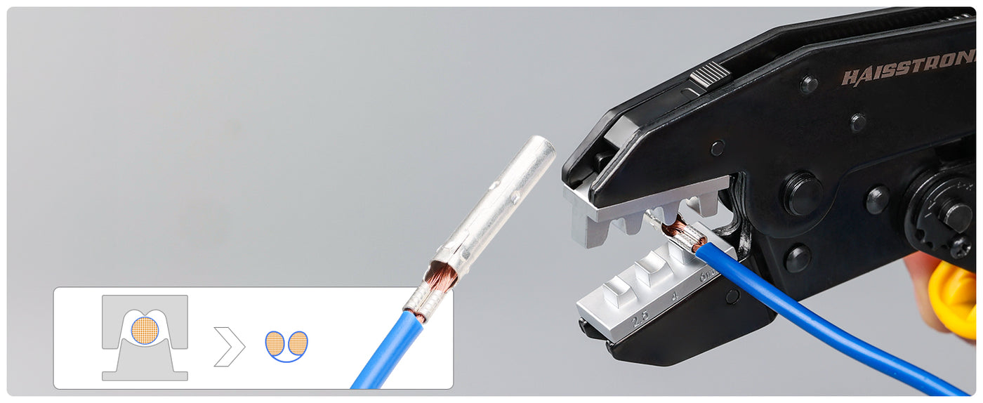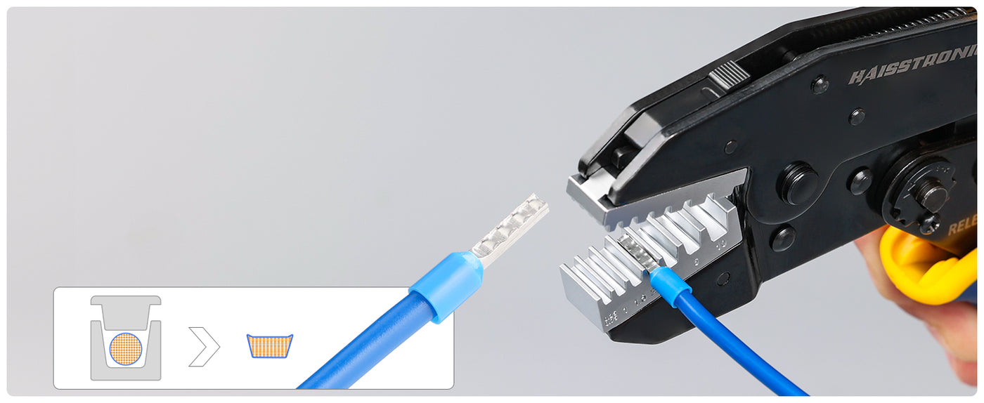 Optimized for ferrules, this die compresses strands into a solid sleeve for reliable wire crimp connectors in terminal blocks. The electric crimpers form a neat crimp sleeve that slides cleanly into spring-clamp and screw-clamp terminals. Compared with crimp with pliers approaches, this crimping tool electrical maintains uniform geometry for easier insertion and fewer loose strands. Ideal for panel builders who want professional electrical crimps on control wiring instead of uneven crimped connectors.