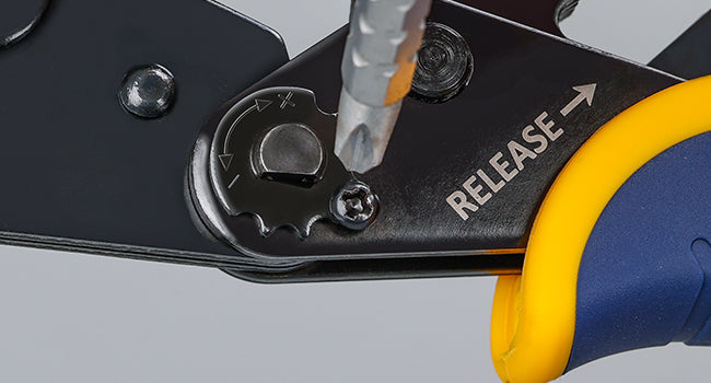 You can control the compression by rotating the adjustable compression wheel. Loosening and removing the screw, rotating the wheel clockwise or counter-clockwise to add or reduce crimping force.