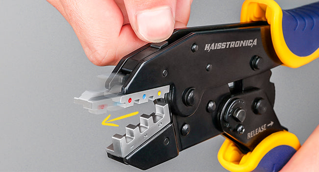 Our slide-in die system uses a proven dual-latch lock: press the two release levers, pull the die, then snap the next set in until it clicks. The die is held securely—no shake, no drop—so you move from spade connectors crimping tool work to ferrules in moments.